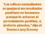 "Los críticos normalmente se quejan si ves resultados positivos en humanos porque lo achacan al pensamiento positivo, o al efecto placebo," dijo el Doctor Larry Dossey, un interno retirado en Santa Fe, y autor de numerosos libros sobre espiritualidad